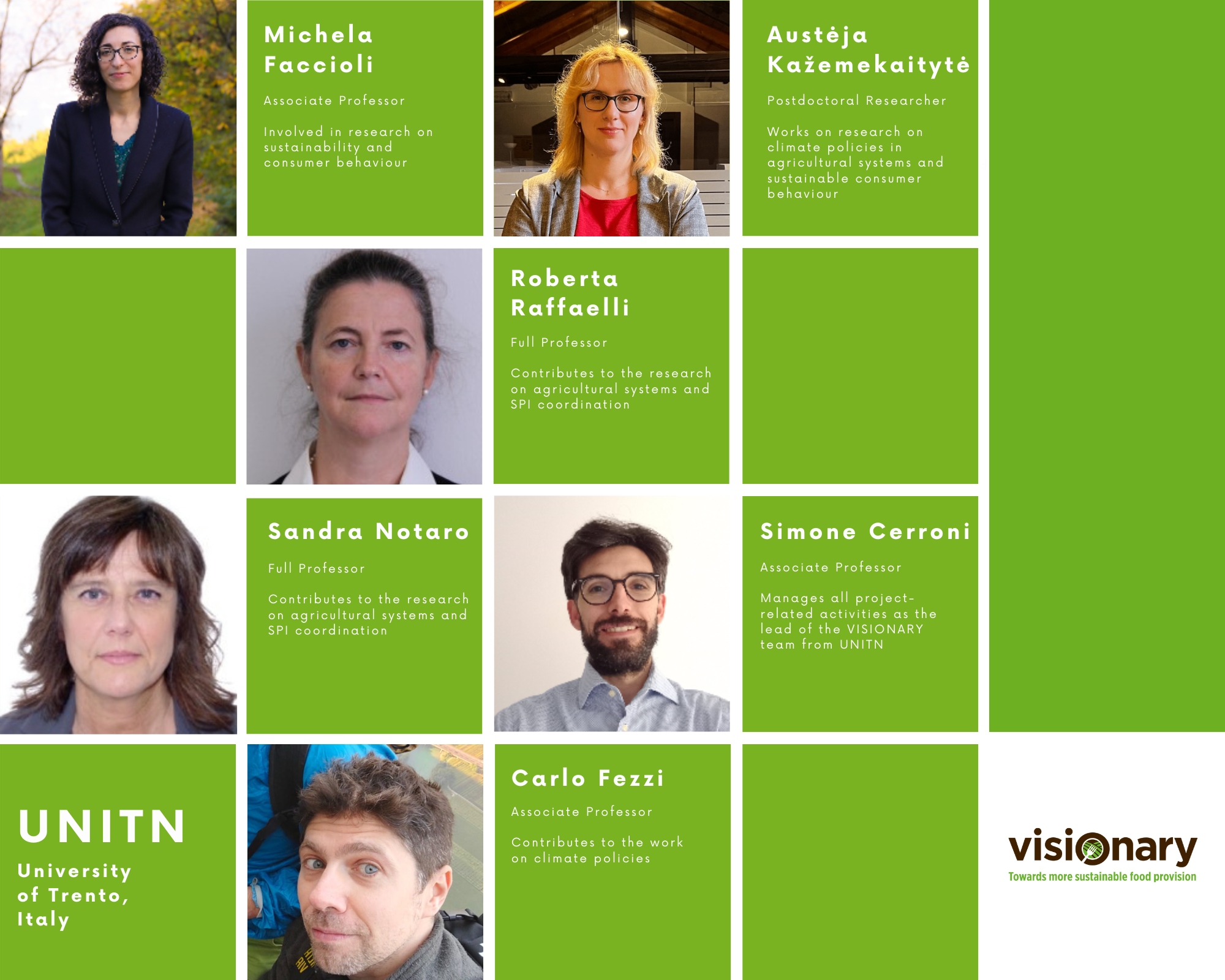Având sediul în nordul Italiei, Universitatea din Trento (UNITN) aduce în cadrul proiectului VISIONARY o expertiză recunoscută la nivel internațional în economia mediului, comportamentală și experimentală. Echipa conduce două sarcini cheie în WP3, concentrându-se pe experimente comportamentale în agricultura durabilă. În sarcina 3.1, coordonează proiectarea și punerea în aplicare a acestor experimente, sprijinind elaborarea de protocoale, formarea partenerilor și alinierea metodologică între țări.